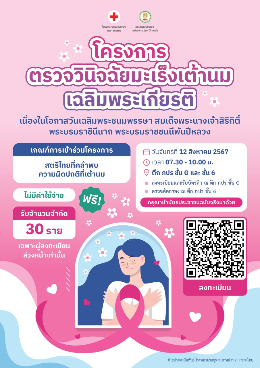รพ.จุฬาลงกรณ์ จัดโครงการตรวจวินิจฉัยมะเร็งเต้านมเฉลิมพระเกียรติ สำหรับสตรีไทยที่คลำพบความผิดปกติที่เต้านม จำนวนจำกัด 30 ราย (เฉพาะผู้ลงทะเบียนล่วงหน้า)