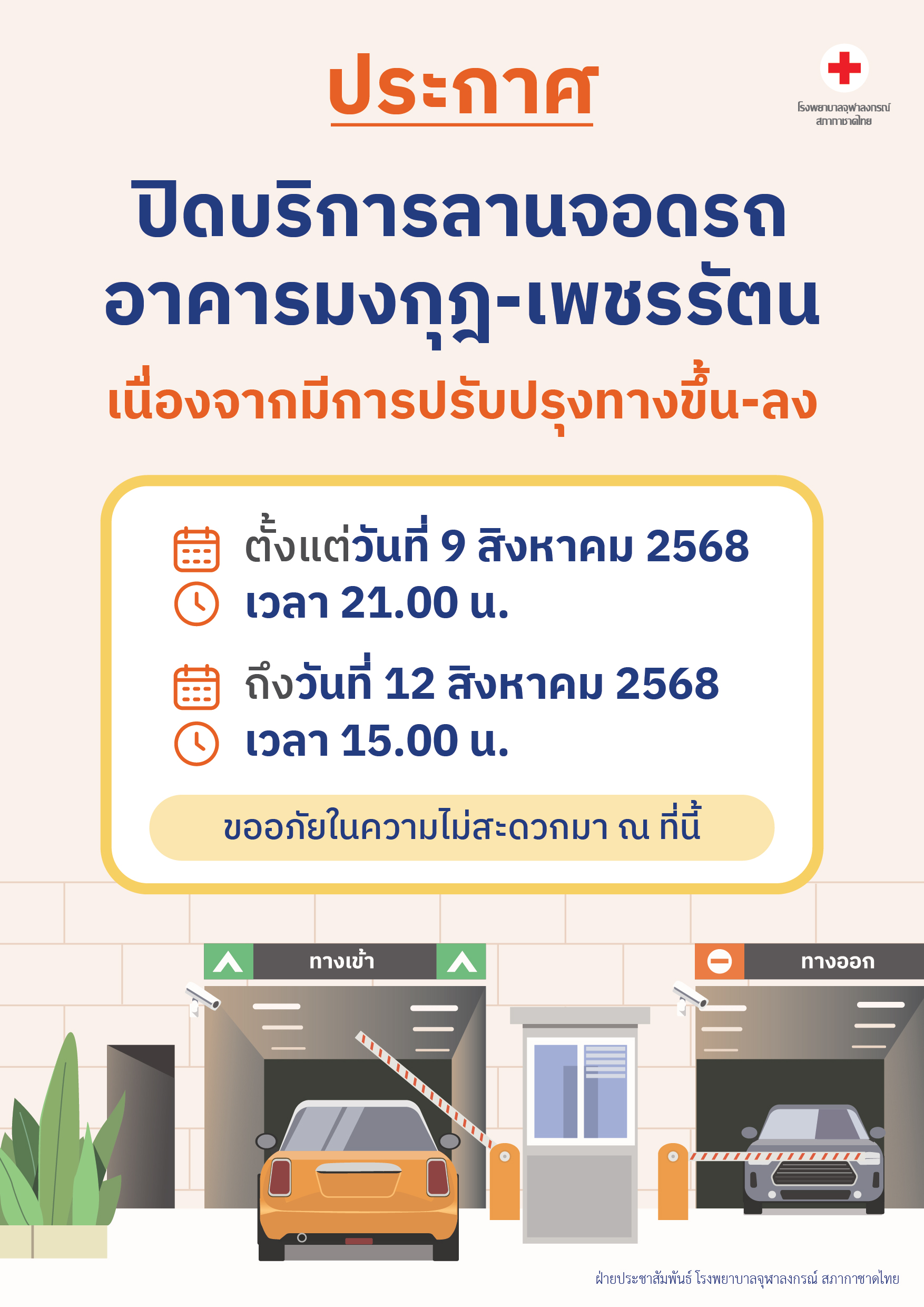 🚗 โรงพยาบาลจุฬาลงกรณ์ ขอปิดบริการลานจอดรถอาคารมงกุฎ-เพชรรัตน เนื่องจากมีการปรับปรุงทางขึ้น-ลง ขออภัยในความไม่สะดวกมา ณ ที่นี้