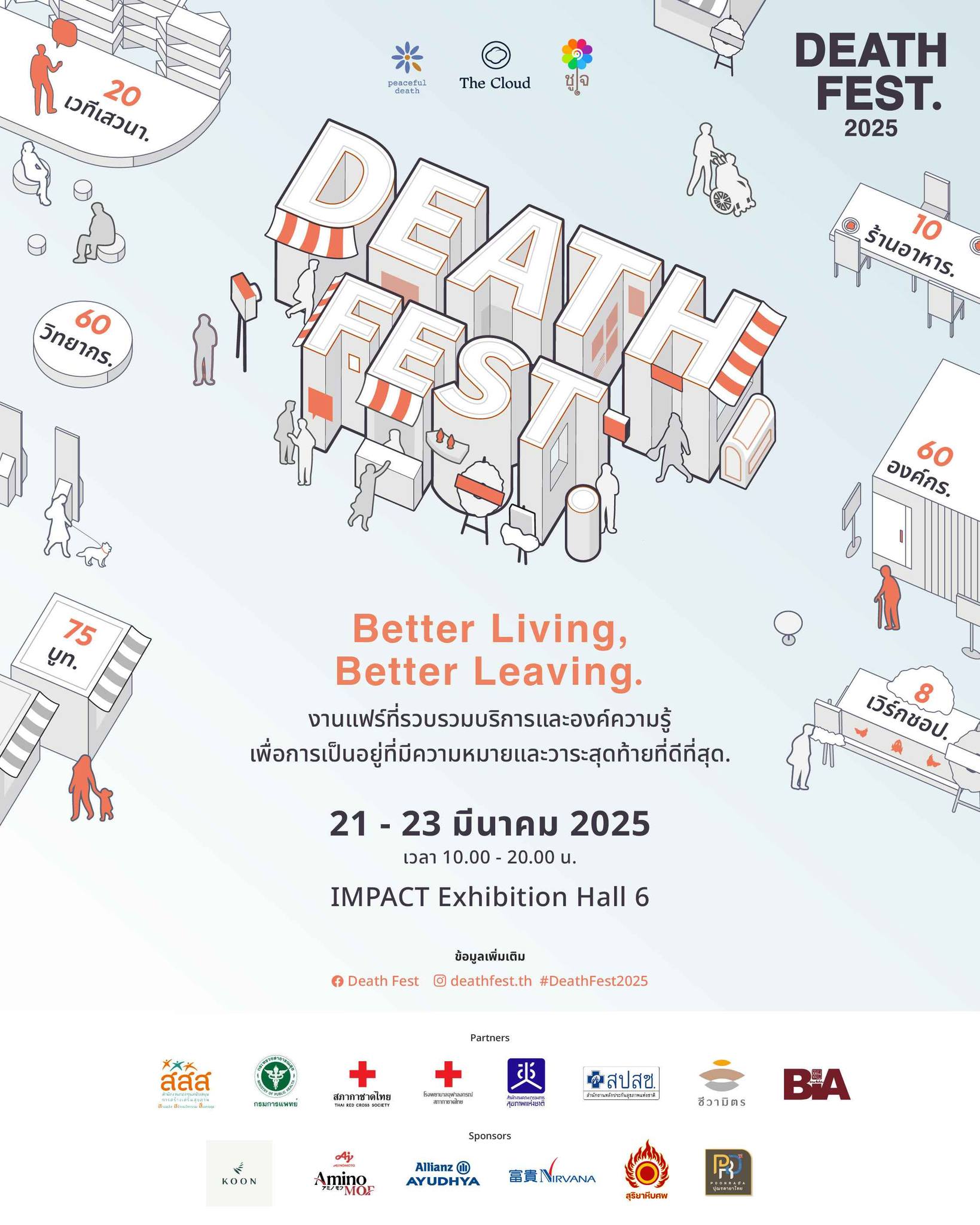 Death Fest 2025 : Better Living, Better Leaving. เพื่อการเป็นอยู่ที่มีความหมาย และวาระสุดท้ายที่ดีที่สุด คืองานแฟร์ที่รวบรวมบริการและองค์ความรู้เพื่อการอยู่ดี-ตายดี ไว้อย่างครบวงจร ตั้งแต่การดูแลผู้สูงวัย ดูแลความเจ็บป่วยไปจนถึงป่วยระยะท้าย การเตรียมตัวเพื่อการจากไป และการจัดการความตาย