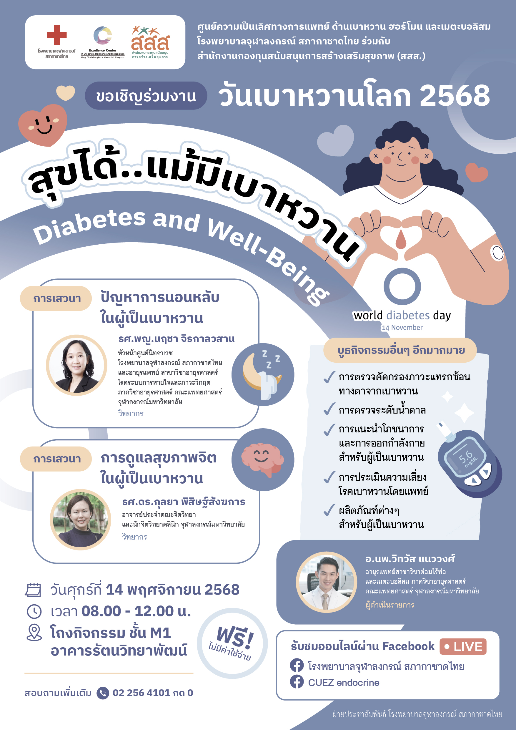 ขอเชิญร่วมงานวันเบาหวานโลก 2568 Diabetes and Well-Being “สุขได้..แม้มีเบาหวาน” รับฟังการเสวนาและชมบูธกิจกรรมอื่นๆ อีกมากมาย ฟรี❗️ไม่มีค่าใช้จ่าย