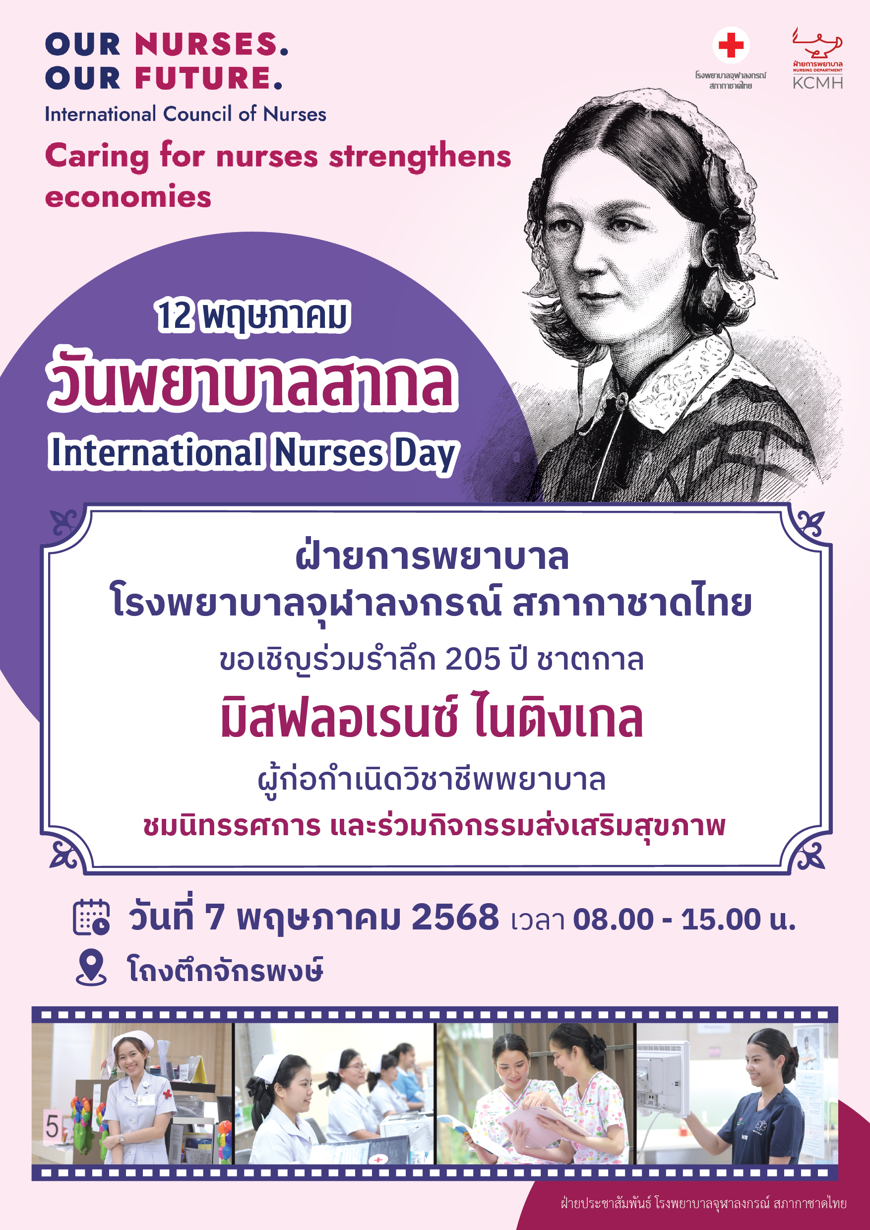 ✨ฝ่ายการพยาบาล โรงพยาบาลจุฬาลงกรณ์ สภากาชาดไทย ขอเชิญร่วมกิจกรรมวันพยาบาลสากล ประจำปี 2568 Our Nurses. Our Future. International Council of Nurses. Caring for nurses strengthens economies.