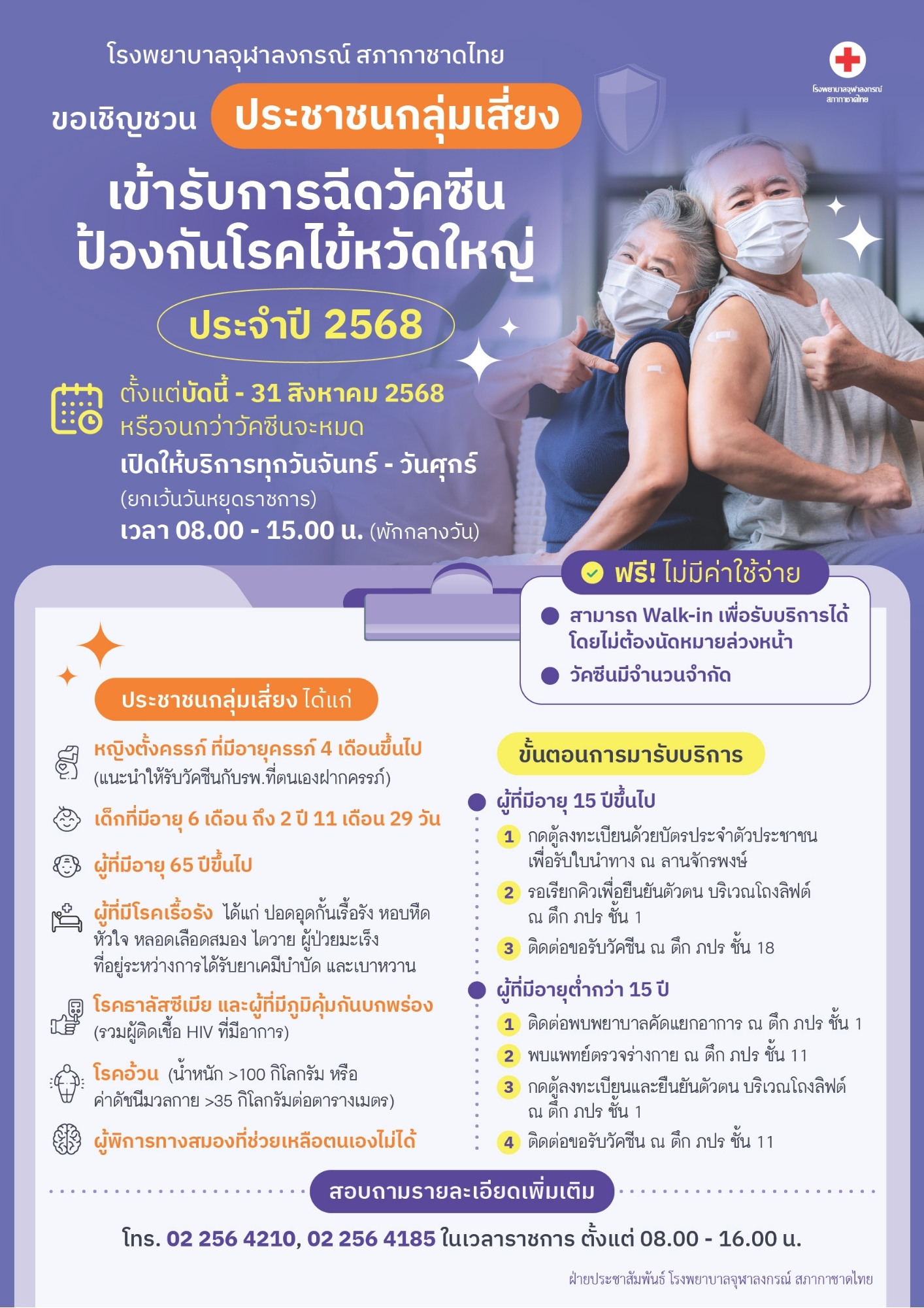 โรงพยาบาลจุฬาลงกรณ์ สภากาชาดไทย ขอเชิญชวนประชาชนกลุ่มเสี่ยง เข้ารับวัคซีนป้องกันโรคไข้หวัดใหญ่ ประจำปี 2568