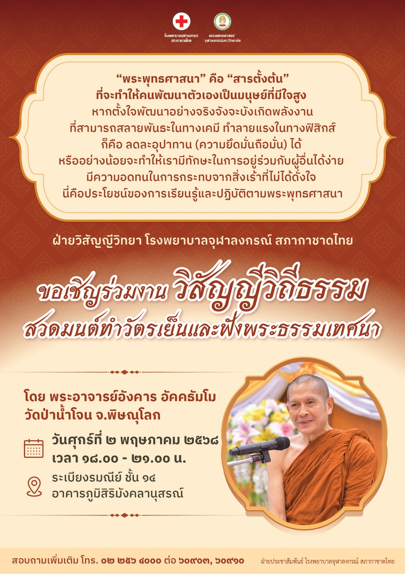 🙏🏻✨ฝ่ายวิสัญญีวิทยา โรงพยาบาลจุฬาลงกรณ์ สภากาชาดไทย ขอเชิญร่วมงานวิสัญญีวิถีธรรม สวดมนต์ทำวัตรเย็นและฟังพระธรรมเทศนา โดย พระอาจารย์อังคาร อัคคธัมโม วัดป่าน้ำโจน จังหวัดพิษณุโลก
