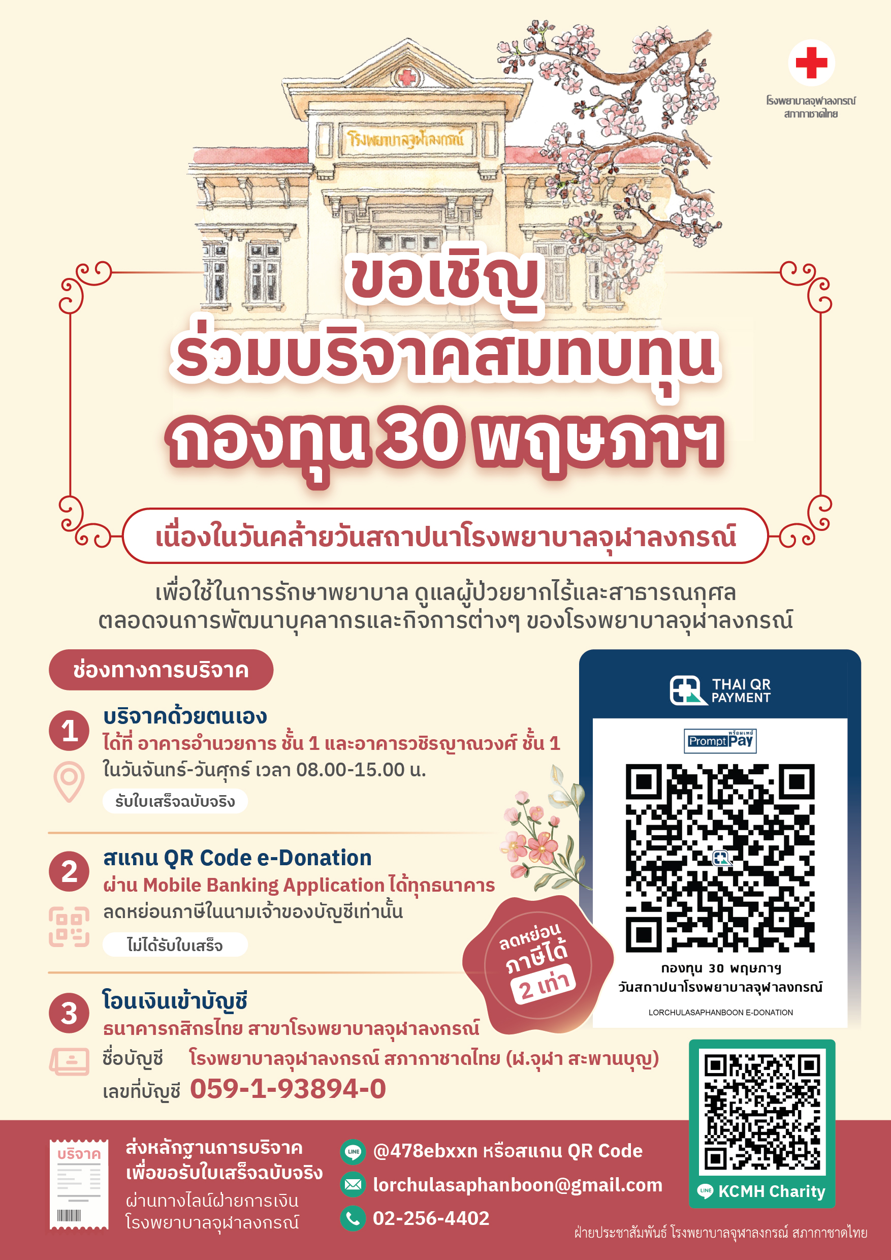😇ขอเชิญผู้มีจิตศรัทธาร่วมบริจาคสมทบกองทุน 30 พฤษภาฯ เนื่องในวันคล้ายวันสถาปนาโรงพยาบาลจุฬาลงกรณ์ สภากาชาดไทย✨ลดหย่อนภาษีได้ 2 เท่า