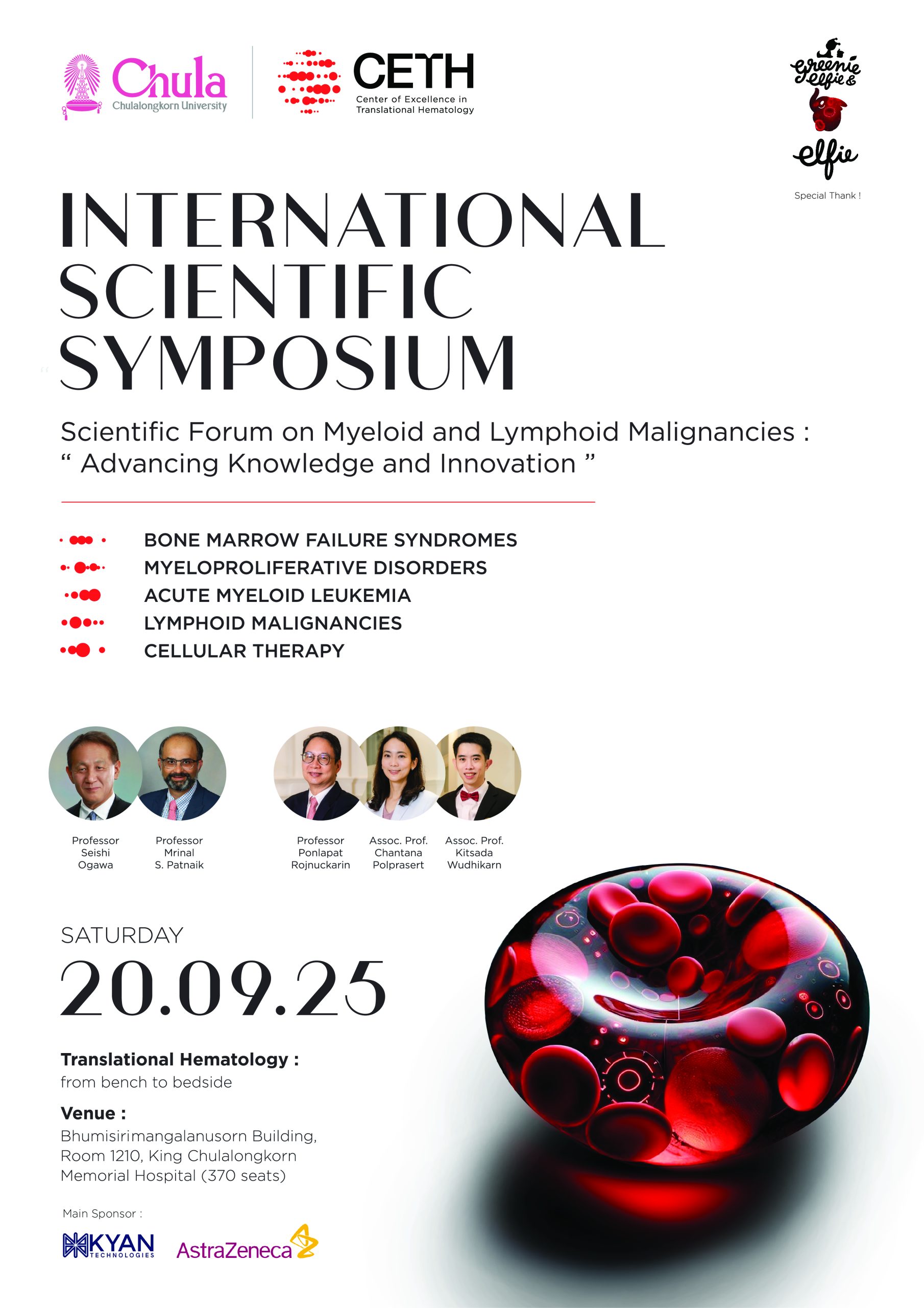 🔬🩸หน่วยโลหิตวิทยา โรงพยาบาลจุฬาลงกรณ์ ขอเชิญเวชปฏิบัติทั่วไป อายุรแพทย์ และบุคลากรทางการแพทย์ที่สนใจ ร่วมอัปเดตความรู้ในการดูแลรักษาผู้ป่วยอายุรกรรมโลหิตวิทยากับการประชุม International Scientific Symposium หัวข้อ Scientific Forum on Myeloid and Lymphoid Malignancies : “Advancing Knowledge and Innovation”