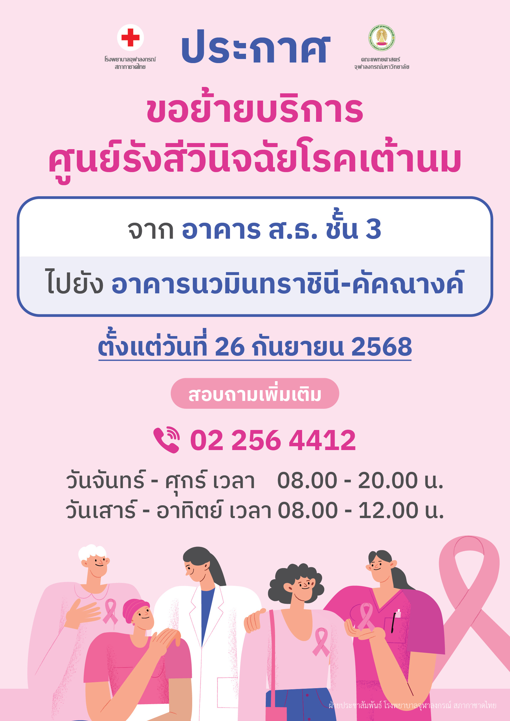 ตั้งแต่วันที่ 26 กันยายน 2568 เป็นต้นไป ขอย้ายบริการศูนย์รังสีวินิจฉัยโรคเต้านม
