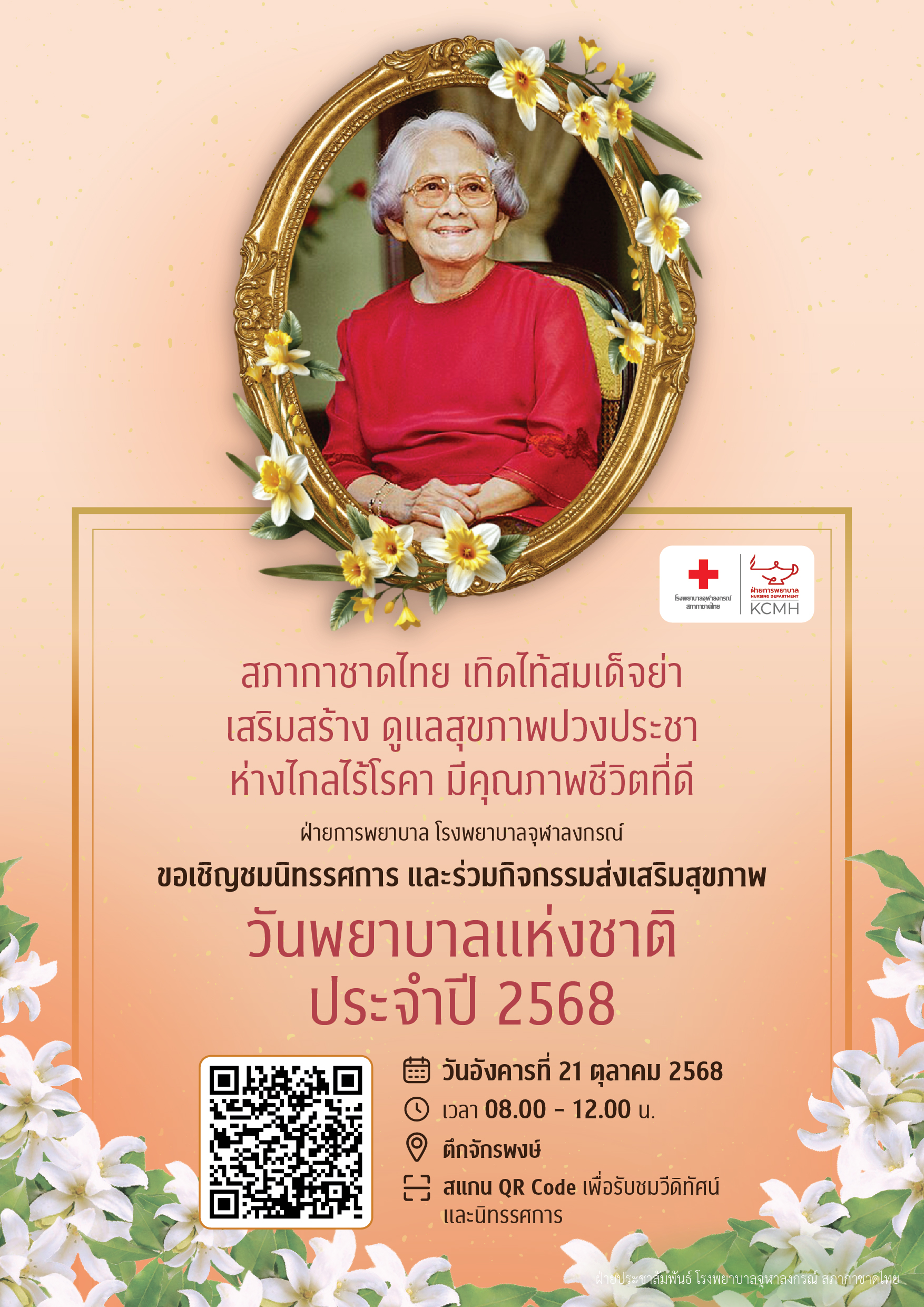 ฝ่ายการพยาบาล โรงพยาบาลจุฬาลงกรณ์ ขอเชิญชมนิทรรศการ และร่วมกิจกรรมส่งเสริมสุขภาพ เนื่องในวันพยาบาลแห่งชาติ ประจำปี 2568 ภายในงานพบกับ..