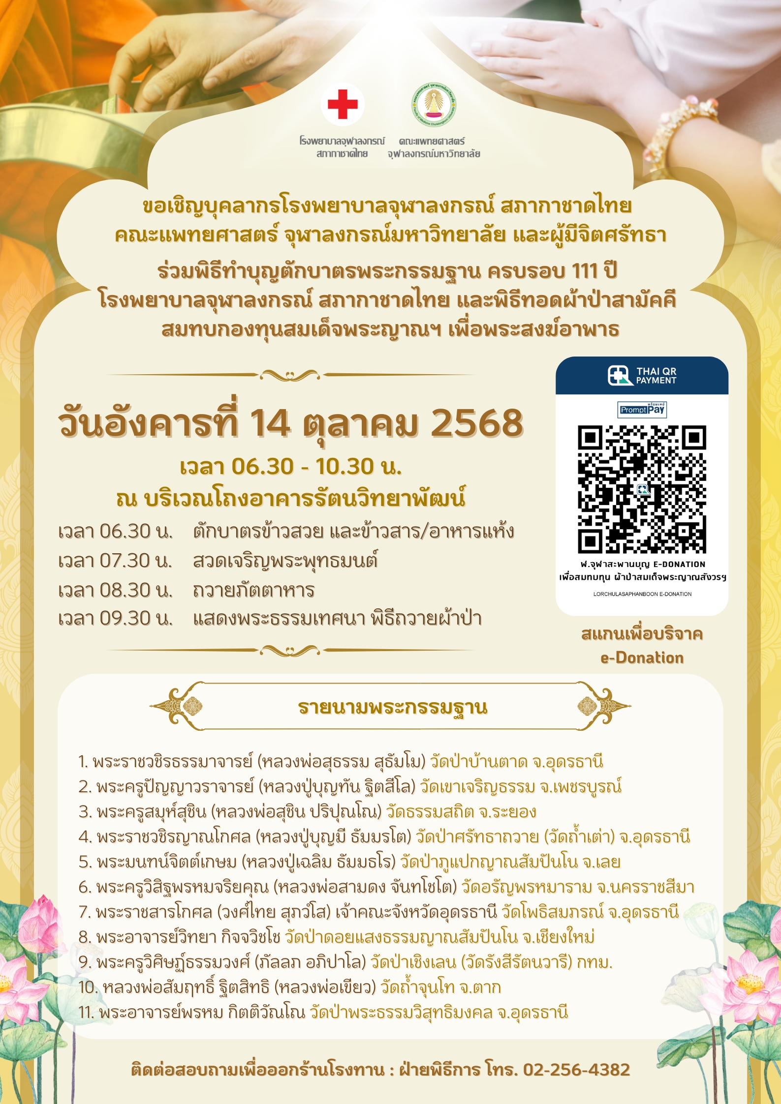🙏🏻✨ขอเชิญผู้มีจิตศรัทธา บุคลากรโรงพยาบาลจุฬาลงกรณ์ และคณะแพทยศาสตร์ จุฬาฯ ร่วมพิธีทำบุญตักบาตรพระกรรมฐาน ครบรอบ 111 ปี โรงพยาบาลจุฬาลงกรณ์ และพิธีทอดผ้าป่าสามัคคี สมทบกองทุนสมเด็จพระญาณฯ เพื่อพระสงฆ์อาพาธ