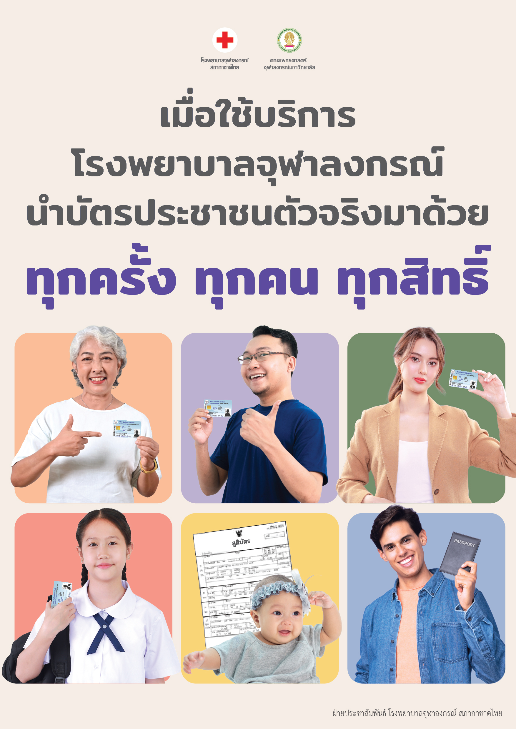 เมื่อใช้บริการโรงพยาบาลจุฬาลงกรณ์ สภากาชาดไทย โปรดนำบัตรประชาชนตัวจริงมาด้วย ทุกครั้ง ทุกคน ทุกสิทธิ์