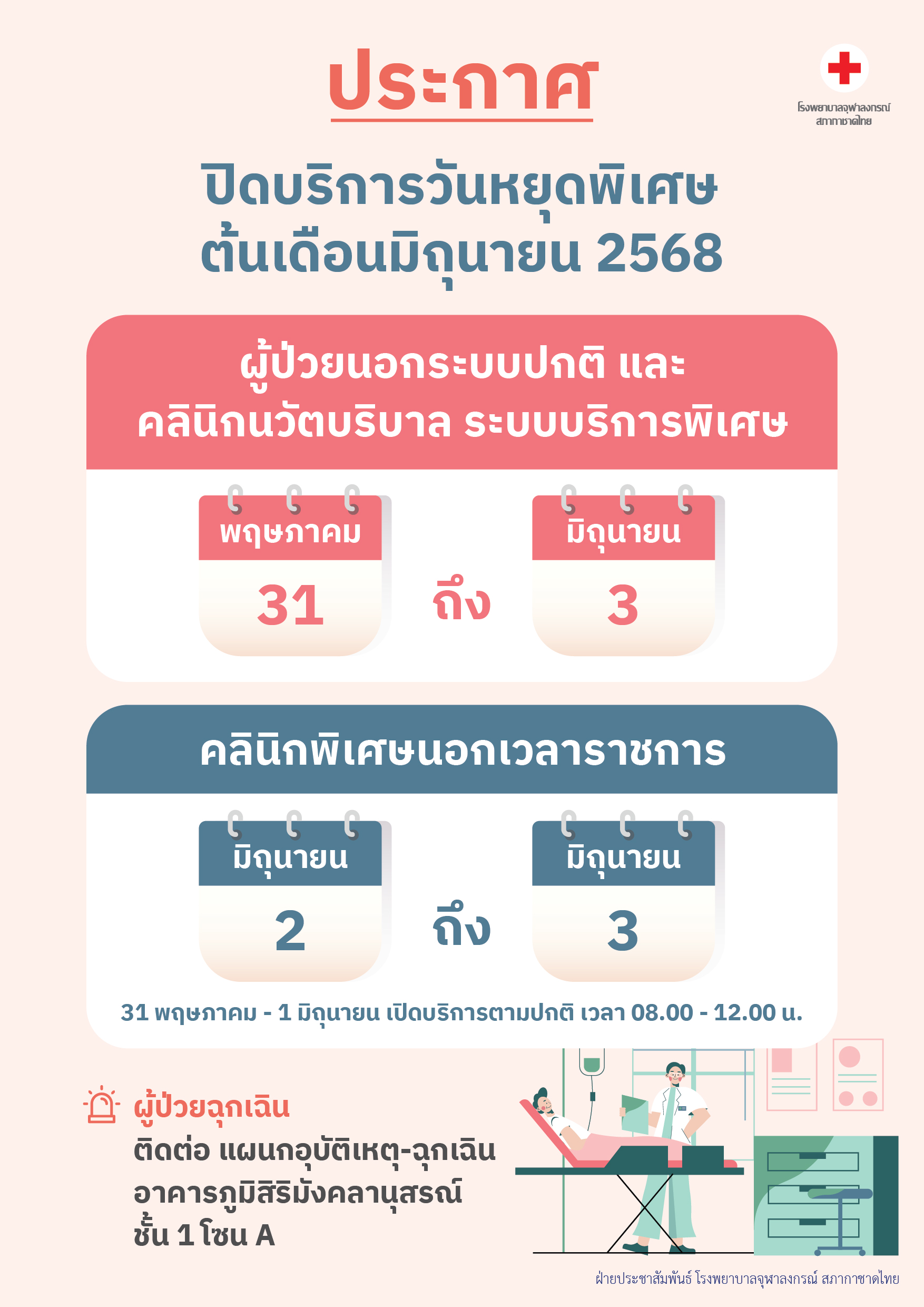 🔴คลินิกพิเศษนอกเวลาราชการ ปิดบริการวันที่ 2 – 3 มิถุนายน 2568