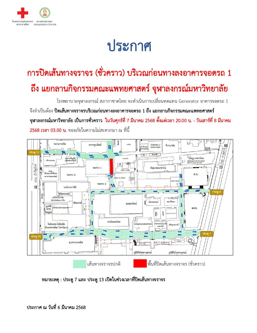ขอปิดเส้นทางจราจรชั่วคราวภายในโรงพยาบาลจุฬาลงกรณ์ สภากาชาดไทย บริเวณก่อนทางลงอาคารจอดรถ 1 ถึงแยกลานกิจกรรมคณะแพทยศาสตร์ จุฬาลงกรณ์มหาวิทยาลัย เพื่อเปลี่ยนทดแทน Generator อาคารจอดรถ 1