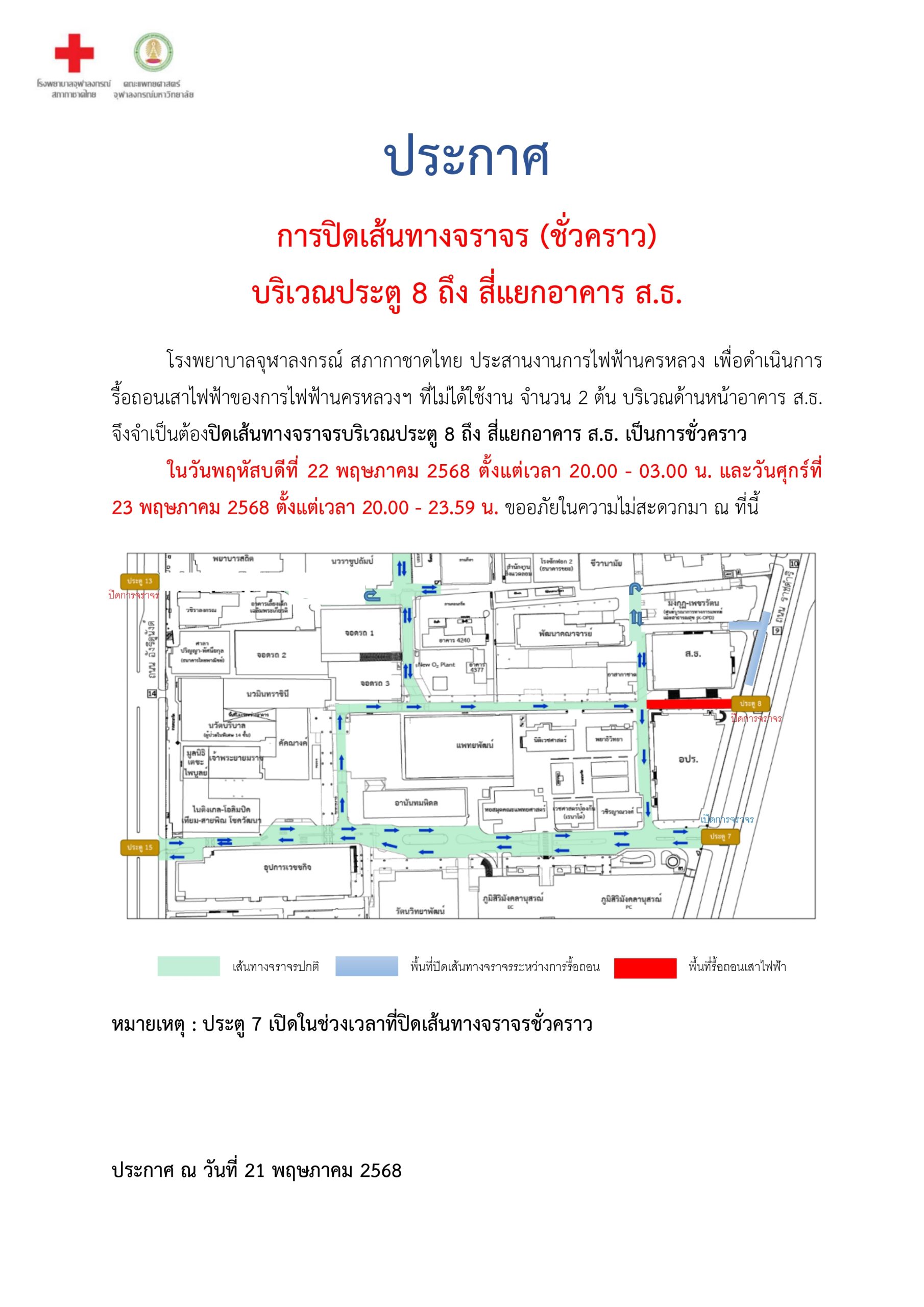 🚨ขอปิดเส้นทางจราจรภายในโรงพยาบาลจุฬาลงกรณ์ สภากาชาดไทย บริเวณประตู 8 ถึง สี่แยกอาคาร ส.ธ. เป็นการชั่วคราว เพื่อรื้อถอนเสาไฟฟ้าของการไฟฟ้านครหลวงที่ไม่ได้ใช้งาน บริเวณด้านหน้าอาคาร ส.ธ.