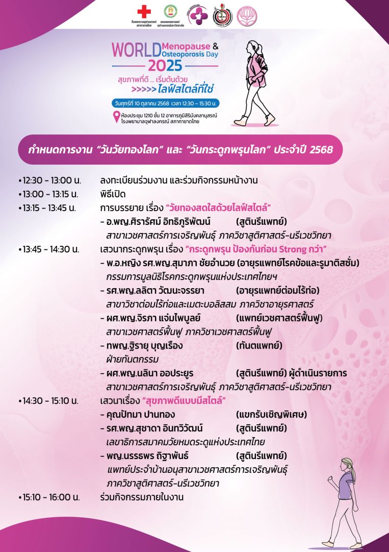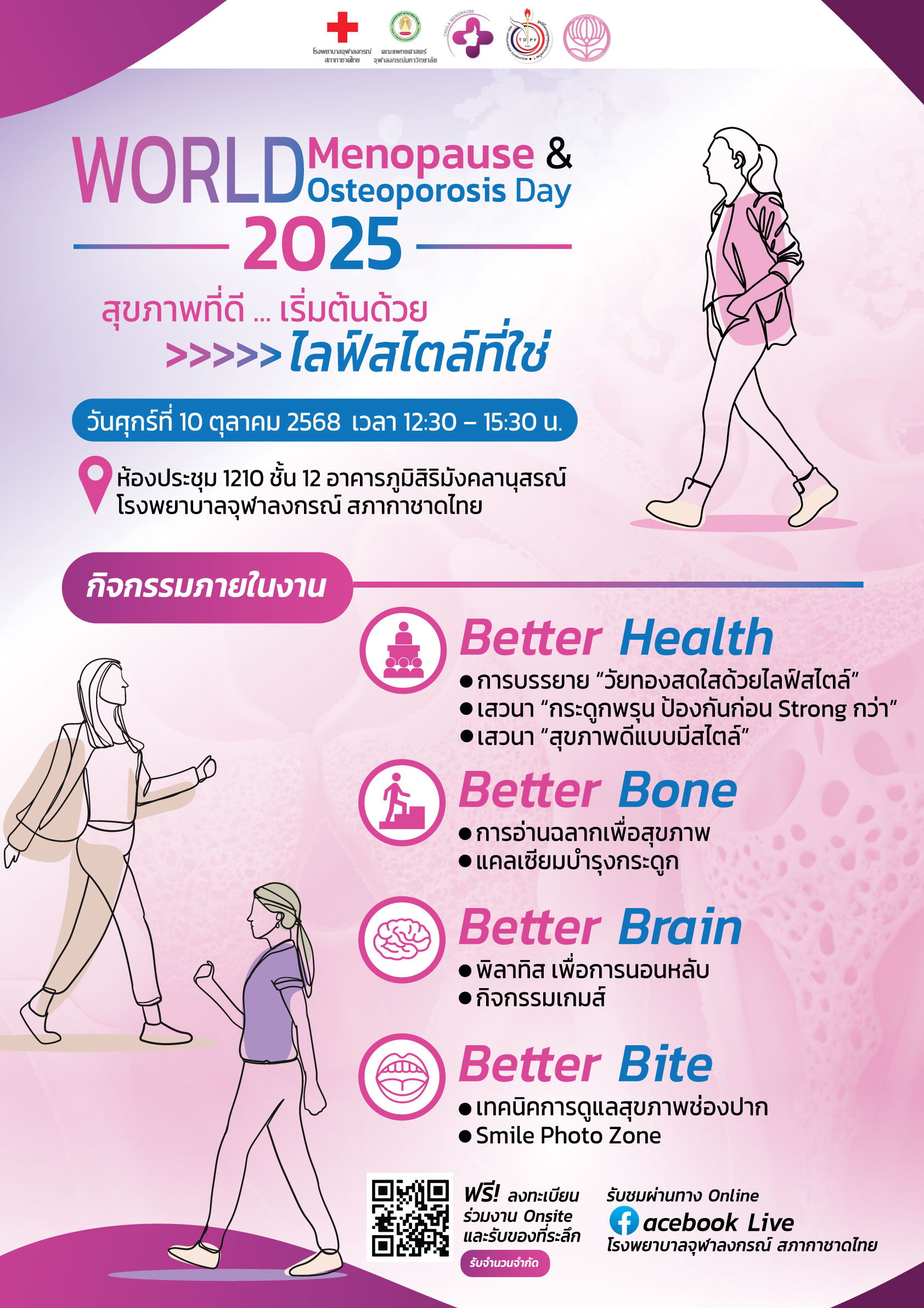 🎉✨ ขอเชิญเข้าร่วมงาน “วันวัยทองโลก” และ “วันกระดูกพรุนโลก” ประจำปี 2568 โดย คลินิกวัยทอง ศูนย์ความเป็นเลิศด้านการดูแลผู้สูงอายุ โรงพยาบาลจุฬาลงกรณ์ สภากาชาดไทย และคณะแพทยศาสตร์ จุฬาลงกรณ์มหาวิทยาลัย ร่วมกับ มูลนิธิโรคกระดูกพรุนแห่งประเทศไทย และสมาคมวัยหมดระดูแห่งประเทศไทย