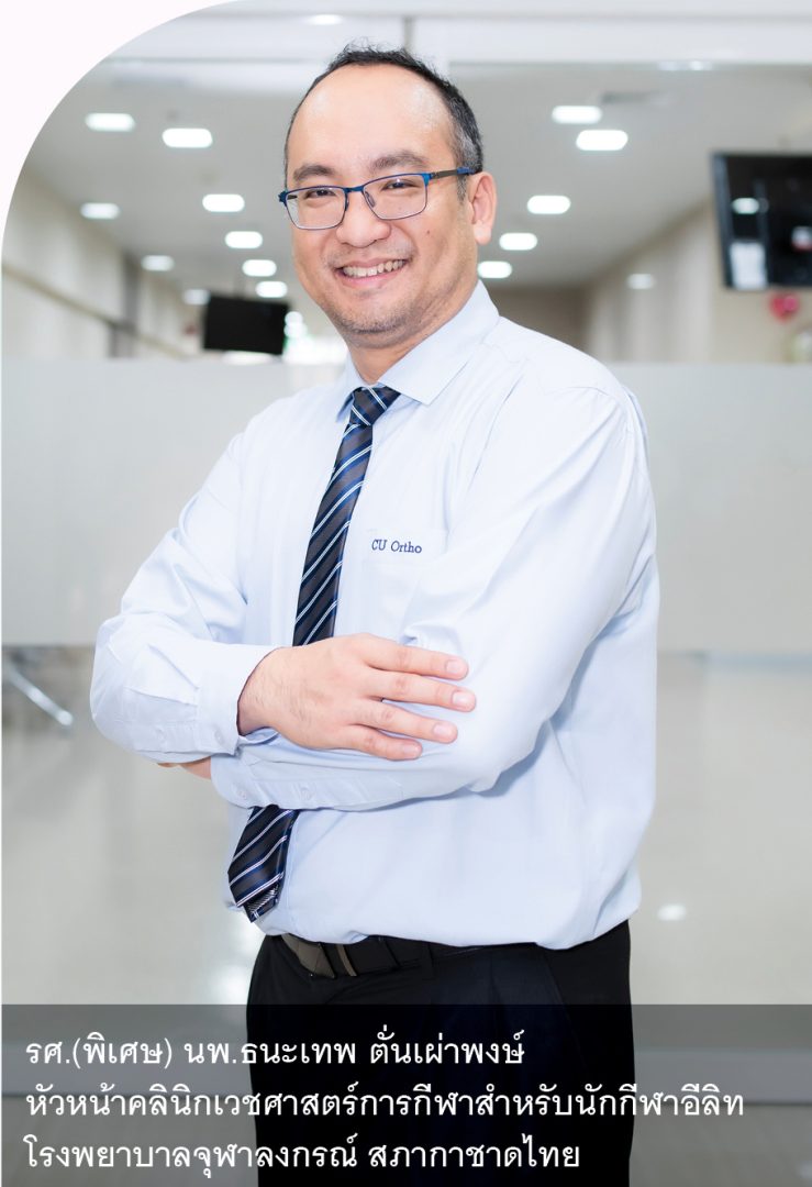 รศ.(พิเศษ) นพ.ธนะเทพ บอกว่า “กีฬาเป็นกิจกรรมที่อยู่คู่กับเราตั้งแต่เด็กจนโต ไม่ว่าจะเล่นกีฬาเป็นงานอดิเรก เล่นเพื่อลงแข่งขัน หรือ เล่นในระดับอาชีพล้วนมีความเสี่ยงที่จะเกิดอาการบาดเจ็บเป็นธรรมดา เวชศาสตร์การกีฬาจึงมีความสำคัญมากในการช่วยรักษาฟื้นฟูนักกีฬาทุกระดับให้กลับไปเล่นได้อีกครั้ง”