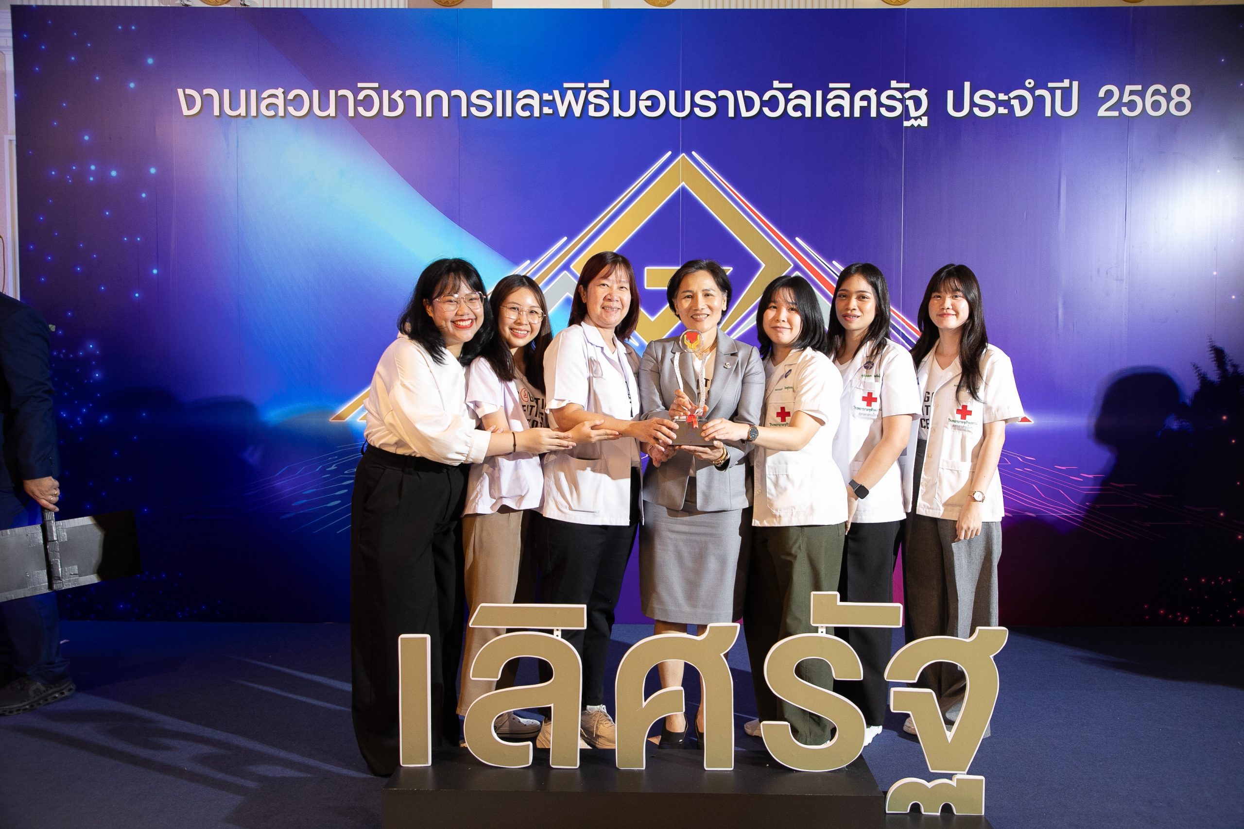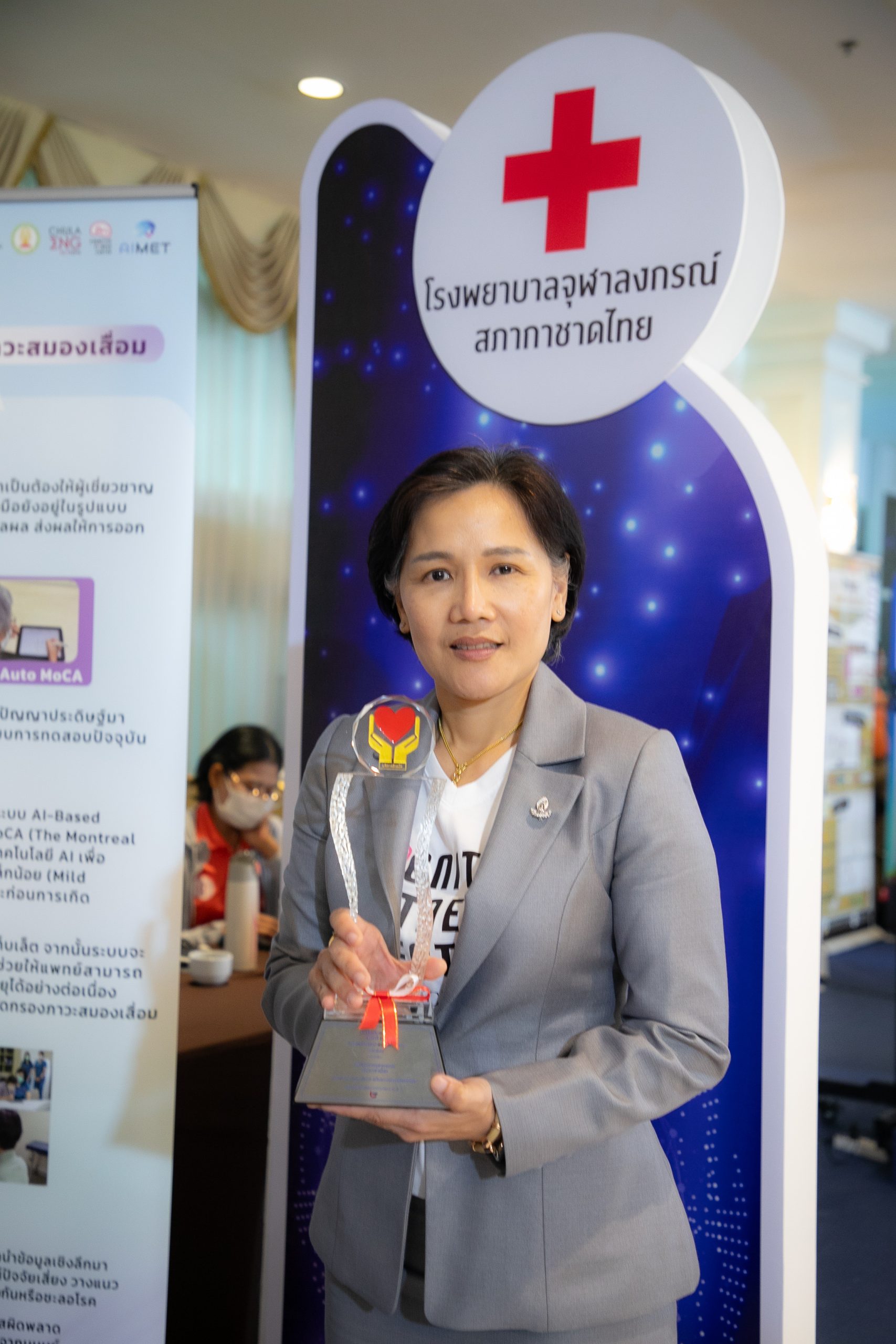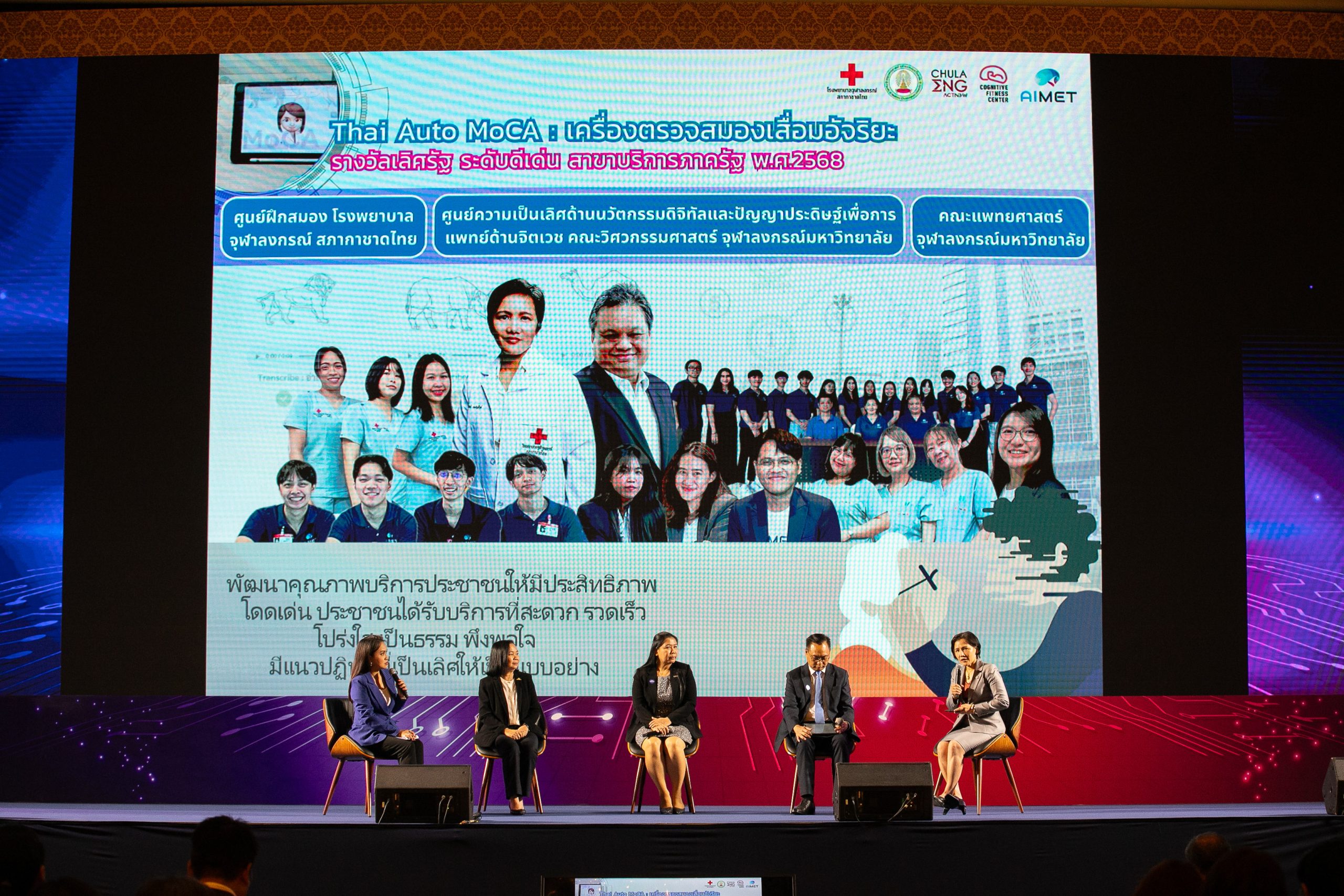 เมื่อวันที่ 12 กันยายน 2568 ศูนย์ฝึกสมอง โรงพยาบาลจุฬาลงกรณ์ สภากาชาดไทย และ ศูนย์ความเป็นเลิศด้านนวัตกรรมดิจิทัลและปัญญาประดิษฐ์เพื่อการแพทย์ด้านจิตเวช (AIMET) ภาควิชาคอมพิวเตอร์ คณะวิศวกรรมศาสตร์ จุฬาลงกรณ์มหาวิทยาลัย และคณะแพทยศาสตร์ จุฬาลงกรณ์มหาวิทยาลัย เข้ารับรางวัลเลิศรัฐ ระดับดีเด่น สาขาบริการภาครัฐ ปี 2568 ในผลงาน “Thai Auto MoCa แบบทดสอบดิจิตอลด้วย AI ประเมินภาวะสมองเสื่อม” โดยมี รศ.ดร.พญ.โสฬพัทธ์ เหมรัญช์โรจน์ หัวหน้าศูนย์ฝึกสมอง โรงพยาบาลจุฬาลงกรณ์ สภากาชาดไทย และรองคณบดีฝ่ายนวัตกรรมแนวบูรณาการและเทคโนโลยีดิจิทัล คณะแพทยศาสตร์ จุฬาฯ พร้อมด้วย ผศ.ดร.ณัฐวุฒิ หนูไพโรจน์ ผู้อำนวยการศูนย์ความเป็นเลิศด้านนวัตกรรมดิจิทัลและปัญญาประดิษฐ์เพื่อการแพทย์ด้านจิตเวช (AIMET) ภาควิชาคอมพิวเตอร์ คณะวิศวกรรมศาสตร์ จุฬาฯ ร่วมรับรางวัลในครั้งนี้ และมี รศ.ดร.นพ.ม.ล.กรเกียรติ์ สนิทวงศ์ รองผู้อำนวยการฯ ฝ่ายบริการ พร้อมด้วยทีมบุคลากรทางการแพทย์ฯ เข้าร่วมงาน “เสวนาวิชาการและพิธีมอบรางวัลเลิศรัฐ ประจำปี 2568 ภาครัฐอัจฉริยะ ขับเคลื่อนอนาคต Smart Government & Smart Services : Driving for the Future ” ซึ่งจัดโดย สำนักงานคณะกรรมการพัฒนาระบบราชการ (สำนักงาน ก.พ.ร.) ณ ห้องรอยัล จูบิลี่ บอลรูม อาคารชาเลนเจอร์ อิมแพคเมืองทองธานี จังหวัดนนทบุรี ที่ผ่านมา